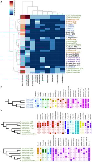 Identification of ARGs in sequenced genomes. (A) Heatmap showing the presence of ARGs identified by ARG-ANNOT indicating the number of each resistance gene per genome. Data were clustered using hierarchical mapping with Euclidian distance. The blue to red scale indicates the number of ARGs for each strain in each category, as indicated in the legend. The nucleotide sequences in ARG-ANNOT from different antibiotics classes are abbreviated as follows—AGly: Aminoglycoside resistance genes; Bla: Beta-lactamases; Fcyn: Fosfomycin; Flq: Fluoroquinolones; Gly: Glycopeptides; MLS: Macrolide–lincosamide–streptogramin; Phe: phenicols; Rif: rifampin; Sul: sulfonamides; Tet: tetracyclines; and Tmt: trimethoprim. (B) Distribution of different ARGs per genome of E. coli, colored by antibiotic category. The maximum likelihood phylogeny for the strains was based on the core genome. (C) Distribution of different ARGs per genome of K. pneumoniae, following the scheme in (B).