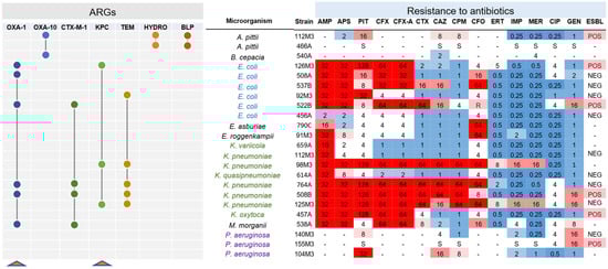 Shared beta-lactamases with 100% identity at the protein level. Seven beta-lactamase coding genes were found as shared among gram-negative strains analyzed. Connected circles indicate that the genes are presented in those strains. On the right, the antibiotic resistance profile of the analyzed strains is shown. Genes for blaOXA-1 and blaKPC are highlighted (red triangles) since these genes were identified in the functional screening carried out in this study. On the right, antibiotic resistance levels are indicated, with numbers indicating the resistance levels in mg/mL. Red indicates resistance to the antibiotic, while blue denotes sensitivity. In the final column it is indicated if the strain is extended-spectrum ß-lactamase (ESBL)-positive or -negative. AMP: ampicillin; APS: ampicillin/sulbactam; PIT: piperacillin/tazobactam; CFX: cefuroxime, CFX-A: cefuroxime axetil; CTX: cefotaxime; CAZ: ceftazidime; CPM: cefepime; CFO: cefoxitin; ERT: ertapenem; IMP: imipenem; MER: meropenem; CIP: ciprofloxacin; GEN: gentamicin.