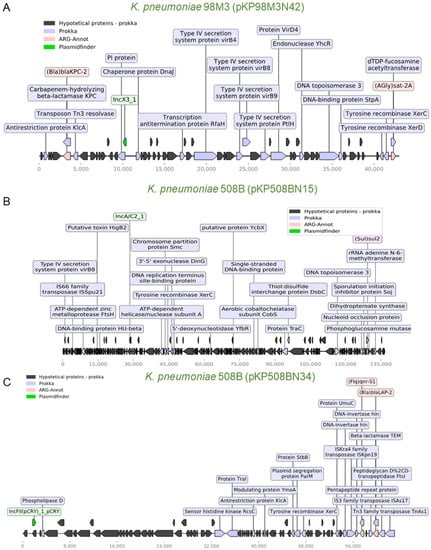 Schematic representation of genes of three K. pneumoniae plasmids. (A) Plasmid pKP98M3N42 (43 kb) from K. pneumoniae 98M3. This plasmid carries two ARGs (blaKPC-2 and sat-2A), elements of a type IV secretion system, two resolvases, and a Tn3 transposase. This plasmid is very similar to pKP125M3N44 from K. pneumoniae 125M3 (Figure S4A). Whole-plasmid visualization was performed using a python module for prokaryotic genome analyses (DnaFeaturesView) and a matplotlib module combined, as well as ARG-ANNOT and Prokka’s results [49]. (B) Plasmid pKP508BN15 (136.8 kb) from K. pneumoniae 508B transports sul2 and an rRNA adenine n-6-methyltransferase (ermC) resistance marker. A transposase, a xerC recombinase, and a type IV secretion system virB8 protein are also found in this plasmid. (C) Plasmid pKP508BN34 (63 kb) is also from K. pneumoniae 508B and carries several transposases and two resistance determinants, qnr-S1 and blaLAP-2. Legends represent the colors code for the identified genes.