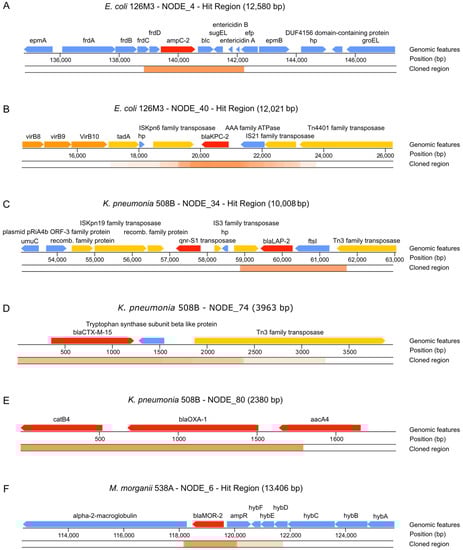 Features found in identified clones conferring resistance to antibiotics. (A) ampC-2 gene identified from E. coli 126M3. (B) blaKPC-2 gene identified from E. coli 126M3. (C) blaLAP-2 gene identified from pKP508BN34 plasmid from K. pneumoniae 508B. (D) blaCTX-M-15 gene identified from K. pneumoniae 508B. (E) blaOXA-1 gene identified from K. pneumoniae 508B. (F) blaMOR-2 gene identified from M. morganii 538A. ORFs are colored according to their function: red—ORFs directly related to antibiotic resistance; orange—ORFs related to virulence; yellow—ORFs related to horizontal transfer of the ARG; blue—ORFs with no identified relation to pathogenesis. The cloned region represents contig regions that were identified in our screenings. Overlapping cloned regions are darker, while dim regions have fewer overlapping identified clones.