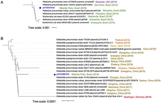 Distance relationship analysis for two plasmids from K. pneumoniae. (A) Distance relationship of the seven closest plasmids’ nucleotide sequences to pKP98M3N42, showing an E-value of less than 0.0 and a minimal sequence cover of 70% in BLAST analysis. The tree was produced using pairwise alignments by means of the fast-minimum evolution method. The year denotes the collection data, and the asterisk indicates the data reported in the public database. (B) Distance relationship of the 18 closest plasmids’ nucleotide sequences to pKP508BN34, showing an E-value of less than 0.0 and a minimal sequence cover of 50% in BLAST analysis. The tree was produced using pairwise alignments by means of the fast-minimum evolution method. The year indicates the collection data and the asterisk indicates the data reported in the public database, provided when the collection data were not available. iTOL (https://itol.embl.de accessed on 1 December 2020) was used for tree visualization.