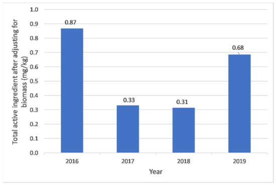 The weight of each active ingredient imported between 2016 to 2019 was calculated by multiplying the weight of active ingredient in one unit of product by the quantity imported. Adjustment for animal biomass was achieved by dividing the total weight of active ingredient by the total animal biomass. The result was expressed in milligram (mg) of active ingredient per kilogram (kg) of animal biomass.