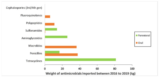The common antimicrobial classes in Timor-Leste (tetracycline, penicillin, and macrolide) are consistent with global and regional (Asia, Far East, and Oceania) usage patterns [29]. The most imported antimicrobials in Timor-Leste (oxytetracycline, amoxicillin, tylosin, and dihydrostreptomycin) were consistent with antimicrobials used in poultry and pig production in developing countries in Asia and Africa [18,50,58,59]. Oxytetracycline is popular because of its broad-spectrum action, low cost, and availability in long-acting formulations [60,61] and it is likely that similar reasons underpin its popularity in Timor-Leste. Amoxicillin and tylosin were imported almost exclusively in oral formulation by commercial poultry farms, and the popularity of these antimicrobials in small scale poultry farms were also reported in other studies in other countries [50,62]. Dihydrostreptomycin was commonly imported in formulations with benzylpenicillin by MAF due to the combination’s broad-spectrum action across a wide range of livestock species. It was positive that colistin, which is an antibiotic of last resort for human medicine that is commonly used in developing countries [63,64] contributed to less than 5% of imports to Timor-Leste with the majority imported in 2016. However, the broiler industry has been importing colistin albeit in small quantities in recent years and this should be closely monitored.