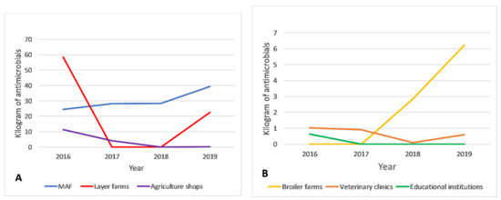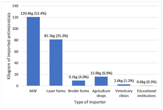 Between 2016 and 2019, the biggest importers of antimicrobials were MAF (120.4 kg; 52.4%), followed by layers farms (81.1 kg; 35.3%) and agriculture shops (15.9 kg; 6.9%) (See Figure 3). There was very strong evidence of a monotonic increase in antimicrobial imports by MAF (rs: 1.0, p value: <0.001) and evidence of a monotonic increase in antimicrobial imports by broiler farms (rs: 0.95, p value: 0.05) but no evidence of a monotonic trend in antimicrobial import patterns for other types of importers (see Figure 4A,B). The pattern of imports by layer farms was unique as imports were high in 2016 (58.6 kg) and 2019 (22.5 kg) but negligible between those years (see Figure 4A). Educational institutions imported a relatively small amount (0.6 kg) of antimicrobials once in 2016. Colistin, neomycin and enrofloxacin were only imported by layer or broiler farms. Cephalosporins were only imported by veterinary clinics. The weights of individual antimicrobials and antimicrobial classes imported by different type of importers for each year during the study period can be found in Supplementary Table S3.