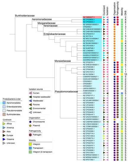 We investigated the genomic context within which the dfrbs were found. In particular, the presence of MGEs can inform us of the capacity of the dfrbs to transfer to other genomes. Ever since the initial discovery of dfrb1 (R67) and dfrb2 (R388) on plasmids, DfrBs have been systematically referred to as being plasmid-borne [38,39]. This is consistent with the importance of plasmids in acquired bacterial resistance [40]. The genomic context was determined by classifying the dfrb-containing genomes as either plasmidic or chromosomal using the PlasFlow classification tool [41]. This resulted in 18 sequences being labelled “plasmids” (30%) and 43 sequences labelled “chromosomes” (70%) (Figure 1). The only sequence identified in Betaproteobacteria was chromosomal. Among the Gammaproteobacteria, all 16 sequences identified in Enterobacterales were plasmidic, whereas the two sequences in Aeromonadales were chromosomal. The Pseudomonadales sequences were chromosomal except for two sequences: one from P. aeruginosa and one from P. putida. Only one plasmidic sequence, that from P. rettgeri, was labelled as pathogenic.