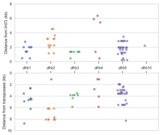 The distance separating the dfrbs from the integrases and transposases was mapped (Figure 3). For dfrb1, dfrb2 and dfrb4, we observed a large variability in those distances, suggesting diversity in their genomic context and thus diversity in the events of integration. In the cases of dfrb3 and dfrb5, the same gene cassette was present in a few sequences, thus the same distance between elements was mapped. For example, all eight dfrb3 genes were found in integrons directly upstream from the class 1 integrase, marking dfrb3 as the gene most recently integrated into the cassette. Interestingly, dfrb3 was found only in plasmids, in Enterobacterales. Six of these genes were found in the short dfrb3/sul1 cassette. Similarly, multiple sequences held the same cassettes containing dfrb5. There were 15 sequences with the aac(6′)-Il/vim-2/dfrb5/aac(3)-Id cassette and five with the aac(6′)-Il/dfrb5/aac(3)-Id cassette; some other cassettes were found twice.