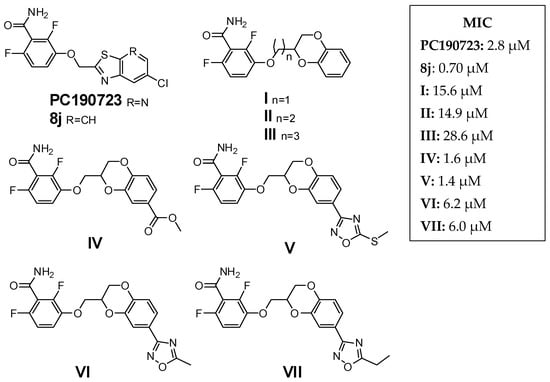 FtsZ, an essential bacterial division protein, has emerged in the last decade as a putative unconventional target, since it plays a crucial role in bacterial replication and viability [11]. Moreover, FtsZ is highly conserved among bacterial species [12], and although it is a functional homolog of human tubulin, their sequences and structures are divergent [13]. Among all the FtsZ inhibitors developed so far, benzamide compounds are the most studied, thanks to their excellent anti-staphylococcal activity, low cytotoxicity, wide chemical accessibility, and the interesting results obtained in association with other antibiotic classes [14,15,16,17]. Along these lines, we recently developed a class of FtsZ inhibitors [18,19,20,21,22] that contain a 2,6-difluoro-benzamide scaffold linked to a differently substituted 1,4-benzodioxane ring. Some of our compounds showed promising MICs for S. aureus, almost comparable to the well-known anti-FtsZ benzamides PC190723 and 8j. Their structures, as well those of PC190723 and 8j [23,24], are reported in Figure 1, together with their MICs on MSSA ATCC29213.