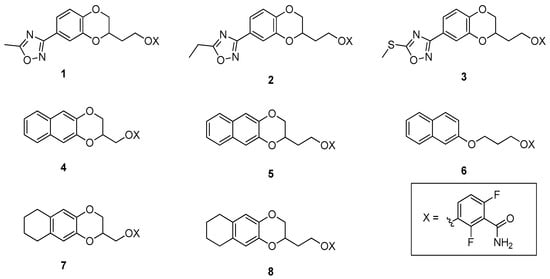 The chemical structures of compounds 1–8 were designed starting from II and V–VII and considering the chemical features of the FtsZ binding site, in terms of lipophilicity and space. Specifically, we would evaluate an elongation from the reference molecule, either in the linker connecting the 1,4-benzodioxane and the 2,6-difluorobenzamide (1–3, 5, and 8 in Figure 2), or adding hydrophobic substituents on the benzodioxane scaffold, (4, 6, and 7 in Figure 2). Nevertheless, as done before [20,22], we first studied in silico compounds 1–8, evaluating their docking poses and calculating their physicochemical properties, to assess their attractiveness.
