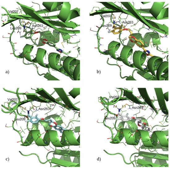 We previously demonstrated by docking analyses that the binding site of these compounds was the interdomain active site of the protein [20,22]. Moreover, in this work, we aimed at confirming the capability of the 2,6-difluorobenzamide to form three hydrogen bonds with the S. aureus FtsZ protein. Specifically, NH2 acted as hydrogen bond donor with Val207 and Asn263, while the carbonyl function as a hydrogen bond acceptor with Leu209. Figure 3 presents the docking results for 2, 3, 5, and 8, the most active compound of this series, as an example.