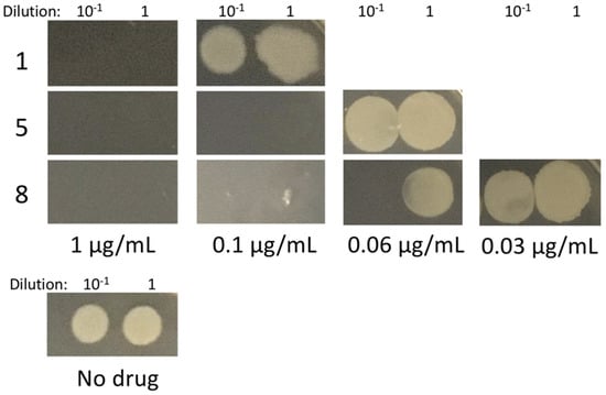 The promising properties of these new compounds prompted us to test them on B. subtilis, a model Gram-positive species used previously in evaluating other benzamides, such as 8j, the benzothiazole derivative of PC190723 [28]. We chose derivatives 1, 5, and 8, which had the lowest MICs on S. aureus and because they were representative of different substituents on the benzodioxane scaffold. B. subtilis strain WM5126 was grown until early log phase, and then 1 × and 10 × dilutions of the culture were spotted onto LB plates containing 0, 0.03, 0.06, 0.1, or 1 µg/mL final concentration of the compounds. Compounds 5 and 8 were the most potent against B. subtilis with MICs under 0.1 µg/mL, whereas compound 1 had an MIC between 0.1 and 1 µg/mL (Figure 4). These trends were perfectly comparable to what we observed with S. aureus MICs.