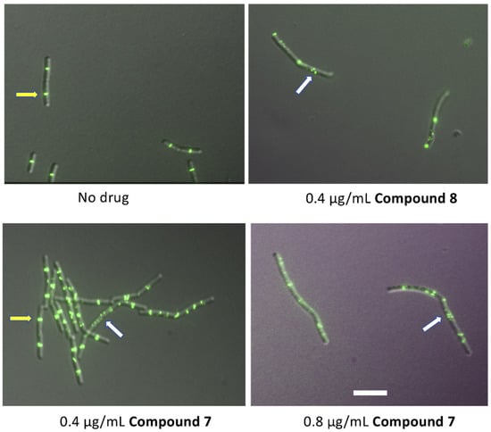 In the absence of our derivatives, all cells displayed normal sharp bands of GFP-ZapA, a well-established proxy for FtsZ and the Z ring [29] (yellow arrows in Figure 5 highlight normal sharp bands at the future division sits). On the contrary, in cells treated with compounds 7 and 8, we observed GFP-ZapA forming many (0.4 µg/mL 7) or nearly all (0.8 µg/mL 7 or 0.4 µg/mL 8) foci or focal clusters (white arrows in Figure 5), and abnormal cell elongation is clearly evident. The perturbation of Z rings and cell elongation is similar to the previously described effects of 8j. The weaker effect of 7 on Z rings vs. 8 is consistent with the significantly higher MIC of 7 on S. aureus (Table 2). These results are clearly consistent with the Z ring and FtsZ as targets of this class of compounds.