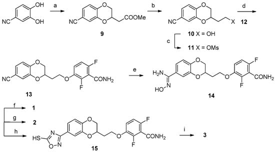 Scheme 1 shows the synthetic pathway for compounds 1, 2 and 3, since the first steps were the same. The synthesis started from the commercially available 3,4-dihydroxybenzonitrile, which was first treated with methyl 3,4-dibromobutyrate, achieving the 7-substituted-1,4-benzodioxane ring, and thus, 9, with good yields. Only low quantities of the 6-substituted derivative were detected via NMR, when comparing our 1H NMR aromatic signals to those of similar 6-substituted benzodioxane derivatives reported in the literature [26], and these traces were easily removed by crystallization of 9 in methanol. After the reduction of the carboxylic group, the alcohol (10) was mesylated (11) and substituted with 2,6-difluoro-3-hydroxybenzamide (12), giving 13 as a white solid. The last mutual intermediate 14 was obtained in quantitative yield by reaction with hydroxylamine hydrochloride in the presence of potassium carbonate. The final compounds 1 and 2 were obtained from 14 by treatment with the proper acetic or propionic anhydride and subsequent treatment with aqueous NaOH, while the achievement of the final compound 3 occurred through 5-mercapto-1,2,4-oxadiazolic ring closure with 1,1′-thiocarbonyldiimidazole (15) and subsequent methylation with methyl iodide.