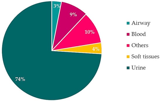 A total of 1794 isolates were included in the analyses. Among them, urine isolates were the most frequent, followed by blood cultures as illustrated in Figure 1.