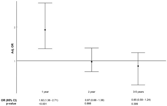 Concerning the decay of the risk of resistance of E. coli isolates to 3GCs over time, the results of the univariate analysis are confirmed in the multivariate model, at least as a trend. As shown in Table 2 and in Figure 2, having received at least one antibiotic prescription three to five years before hospitalization was associated with a lower risk for patients of being colonized or infected with 3GC-resistant E. coli (OR 0.85, 95% CI 0.59–1.24, p = 0.399) than receiving an antibiotic prescription both in the second year before hospitalization (OR 0.97, 95% CI 0.68–1.38, p = 0.866) or in the year preceding hospitalization (OR 1.92, 95% CI 1.36–2.71, p < 0.001).