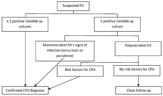 The criteria to diagnose CPJI are not well established, and the same criteria used in diagnosing bacterial PJIs may not be reliable in some cases. The Infectious Diseases Society of America (IDSA) guidelines [3], a previous International Consensus on PJIs [6], and a recent European Bone and Joint Infection Society (EBJIS) consensus [26] consider two or more intraoperative cultures or the combination of preoperative aspiration and intraoperative cultures yielding the same organism definitive evidence of a PJI [3]. However, when reviewing published series of CPJI cases, the microbiological criteria changed from one study to another. Some authors consider that one positive preoperative aspiration culture and/or a positive intraoperative culture is sufficient [9], while others require two positive cultures [2,13] or one positive culture with additional criteria for PJIs [2,24]. In our opinion, when Candida spp. are found in only one intraoperative culture, the case should be evaluated carefully, and treating the Candida etiology should be considered, especially in patients with other risk factors for CPJI such as previous antibiotic therapy or multiple previous surgeries (Figure 1). In fact, even if another microorganism is isolated in two or more cultures, polymicrobial infection is not infrequent, particularly in the hip location, being found in 16% to 26% of cases, depending on the series [2,12], and this should not be a criterion for discarding the value of one positive culture for Candida spp.