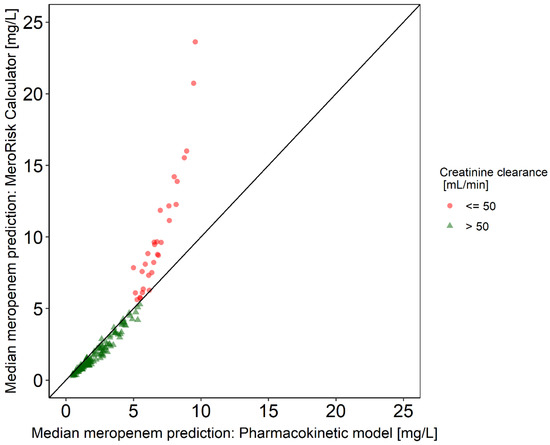 The comparison of median predicted concentrations 8 h after dose (Figure 1) showed a very good agreement for patients with a CLCRCG above 50 mL/min (green triangles). Below 50 mL/min (red points) the MeroRisk-Calculator predicted higher concentrations compared to the PK model.