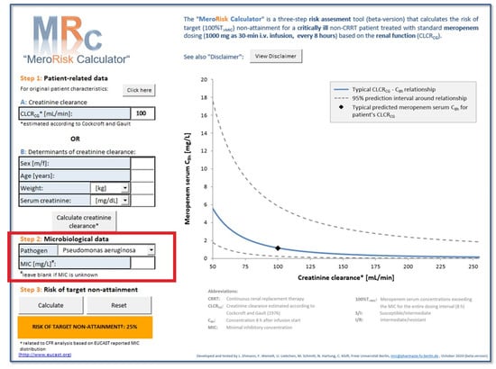 The extended version of the MeroRisk-Calculator containing a feature to assess risk based on the selected pathogen is provided as Supplementary Materials B. The tool is compatible with Windows operating systems and Excel version 2010 and newer. Due to changing MIC distributions an up-to-date version of the MeroRisk-Calculator integrating the latest MIC distributions reported by EUCAST can be found online (https://www.bcp.fu-berlin.de/en/pharmazie/faecher/klinische_pharmazie/arbeitsgruppe_kloft/forschung/MRc, (accessed on 16 April 2021)). In each version of the MeroRisk-Calculator, the origin of the employed MIC distribution data is displayed to the user during risk assessment. The intuitive user interface of the MeroRisk-Calculator remained unchanged by the update (Figure 3). Either the CLCRCG or its determinants (sex, age, total body weight, serum creatinine concentration) of a patient need to be provided for risk assessment. In the extended version, all information about the pathogen becoming available over the course of antibiotic treatment are used. If both the pathogen and its MIC value are unknown at therapy start, the MIC entry remains blank and the pathogen entry, “unknown”. In this case risk calculations are based on EUCAST MIC breakpoints chosen by the user. If the pathogen is known but its MIC value is unknown, the respective pathogen can be selected from the dropdown menu. In this case the risk of target non-attainment for the patient is calculated based on CFR analysis and the EUCAST MIC distribution of the selected pathogen [26]. If both pathogen and MIC values are known, they are entered into the MeroRisk-Calculator and risk calculations are based on the provided MIC value. The result of the risk assessment for target non-attainment are displayed in the originally color-coded box (green ≤ 10%, orange > 10% to ≤ 50%, red > 50%) and a graphical illustration of the relationship between CLCRCG and minimum meropenem concentration 8 h after standard dose including the 95% prediction interval is provided.