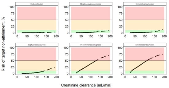 In Figure 4 the risk predictions of the MeroRisk-Calculator for six selected clinically relevant pathogens and 155 critically ill patients are presented. Higher creatinine clearances were linked to higher risks of target non-attainment. For susceptible pathogens like Escherichia coli or Streptococcus pneumoniae, the risk of target non-attainment after standard dose was found to be low. More resistant pathogens like Pseudomonas aeruginosa or Acinetobacter baumannii displayed higher risks of target non-attainment for the majority of the investigated patients. Detailed results for all pathogens in the EUCAST database are listed in the Supplementary Materials Figures C1–C5. Overall risk of target non-attainment predicted by the MeroRisk-Calculator was found to be low for most pathogens and the investigated 155 critically ill patients: 73.0% of pathogens revealed median risks below 10%, 18.9% between 10% and 50% and only 8.1% above 50%.
