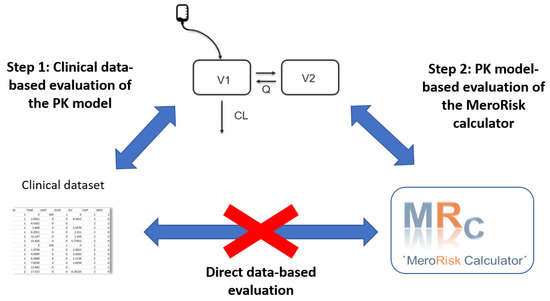 Stepwise evaluation strategy of the MeroRisk-Calculator using a clinical routine dataset. A direct, data-based evaluation of the MeroRisk-Calculator was not feasible due to the time variable sampling time points under routine conditions. A population pharmacokinetic (PK) model was evaluated for its potential to predict the concentrations observed at variable time points (Step 1) and the risk predictions by the PK model were used as a benchmark for the risk predictions of the MeroRisk-Calculator (Step 2).