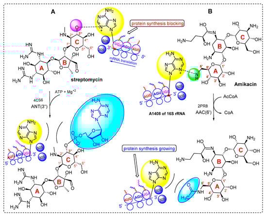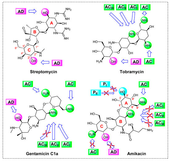 - Zárate, S.G.; De la Cruz Claure, M.L.; Benito-Arenas, R.; Revuelta, J.; Santana, A.G.; Bastida, A. Overcoming aminoglycoside enzymatic resistance: Design of novel antibiotics and inhibitors. Molecules 2018, 23, 284. [Google Scholar] [CrossRef] [PubMed]