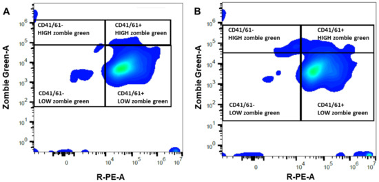 Representative density plot for flow cytometric analyses performed on platelet-rich (A) and -poor (B) plasma obtained from a mare susceptible to persistent-breeding induced endometritis. Platelets were identified with a primary (mouse monoclonal antibody anti CD41/61) and secondary antibody anti-mouse IgG conjugated with a fluorochrome (PE, R-phycoerythrin, X-axis) and their membrane integrity was assessed with Zombie Green (Y-axis). The right quadrants enclosed CD41/61 positive events, presumptively corresponding to platelets, with high (damaged membrane) or low (intact membrane) Zombie Green signal. The left quadrants included CD41/61 negative events, likely debris, with high or low Zombie Green signal.