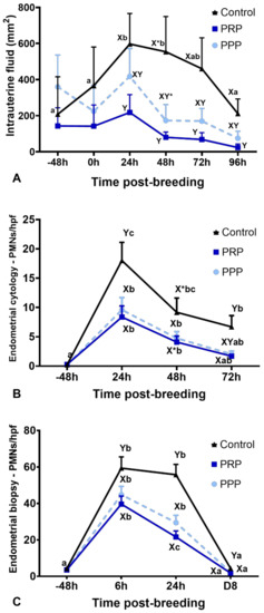 Post-breeding inflammatory response in mares susceptible to persistent breeding induced endometritis. Assessments were carried out from pre- (early onset of estrus) and post-breeding, and on the day of embryo flushing (eight days post-ovulation, D8): (A) Intrauterine fluid accumulation pre- and post-breeding; (B) mean polymorphonuclear cells (PMNs) assessed in five high-power fields (hpf) in endometrial cytology, and (C) mean PMNs counts assessed in five hpf in endometrial biopsies. Mares (n = 12) had estrous cycles (n = 34) assigned to receive four intrauterine infusions with Lactate Ringer’s Solution (Control, n = 12), platelet-rich (PRP n = 12), or -poor plasma (PPP n = 10) in a crossover design. Different superscripts denote the effects of time (a,b,c) and differences between groups (X,Y) (p < 0.05). Asterisk (*) denotes tendency (0.05 < p < 0.1).