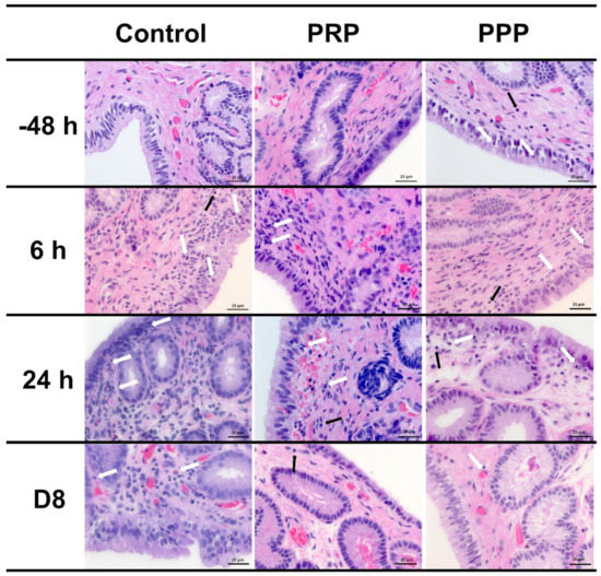 Representative images of H&E-stained endometrial biopsies collected from mares susceptible to persistent breeding-induced endometritis pre- (−48 h) and post-breeding (6 and 24 h), and on the day of embryo flushing (eight days post-ovulation, D8). Mares were treated with four intrauterine infusions of Lactated-Ringer’s solution (Control), platelet-rich (PRP), or -poor plasma (PPP). White arrows indicate neutrophils and black arrows indicate lymphocytes. Magnification ×400.