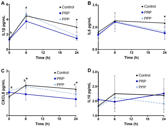 Concentrations (log10) of cytokines ((A), IL1β; (B), IL6; (C), CXCL8; (D), IL10), in uterine fluid of mares susceptible to persistent breeding induced endometritis. Assessments were carried out from pre- (0 h, early onset of estrus), 6, and 24 h post-breeding. Mares (n = 6) had estrous cycles (n = 18) assigned to receive four intrauterine infusions with Lactate Ringer’s Solution (Control, n = 6), platelet-rich (PRP n = 6), or -poor plasma (PPP n = 6) in a crossover design. Different superscripts denote the effects of time (a,b,c). Asterisk (*) denotes difference between control- and PRP-assigned cycles (p < 0.05).