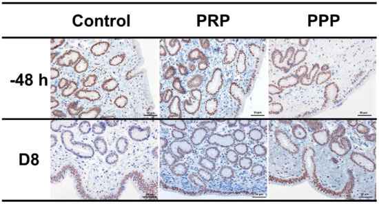 Representative images of immunohistochemical PR expression in uterine biopsies (200× magnification) from mares susceptible to persistent breeding-induced endometritis pre-breeding (−48 h) and on the day of embryo flushing (eight days post-ovulation, D8). Mares were treated with four intrauterine infusions of Lactated-Ringer’s solution (Control), platelet-rich (PRP), or -poor plasma (PPP). Positive nuclei to PR were brown-stained, while negative nuclei were blue stained by hematoxylin counterstain.