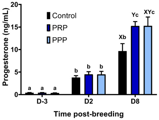 Circulating progesterone concentrations pre- and post-ovulation in mares susceptible to persistent breeding induced endometritis. Mares (n = 12) had estrous cycles (n = 34) assigned to receive intrauterine infusions with Lactate Ringer’s Solution (LRS) (Control, n = 12), platelet-rich (PRP n = 12), or -poor plasma (PPP n = 10) in a crossover design. Assessments were carried out from the early onset of estrus (D-3), 48 h post-ovulation (D2) and on the day of embryo flushing, eight days post-ovulation (D8): Different superscripts denote the effects of time (a,b,c) and differences between groups (X,Y) (p < 0.05).