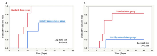 Using Kaplan–Meier analysis, the cumulative incidence rates of thrombocytopenia and severe thrombocytopenia were significantly lower in the initially reduced-dose group than the standard-dose group (p = 0.023 and p = 0.036, log-rank test) (Figure 1).