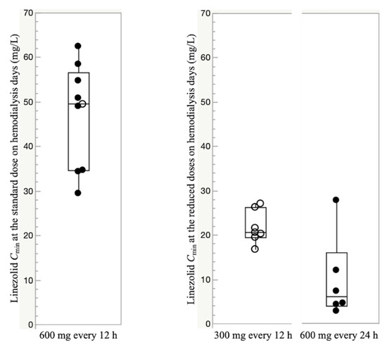 There were no episodes of experiencing linezolid underexposure (<2 mg/L) even when administered a reduced dose of 600 mg per day (Figure 2). Based on these results, a reduced dose of 600 mg per day (300 mg every 12 h or 600 mg every 24 h) may be recommended as an optimal dose in hemodialysis patients. The analysis of the first Cmin of the three episodes in the initially reduced-dose group suggested the possibility that hemodialysis patients may achieve optimal linezolid blood levels before reaching a steady state, even though their doses were initially reduced. However, the wide interindividual variability in Cmin was observed and using TDM is thus essential to any intervention evaluating initial dose reduction in hemodialysis patients.