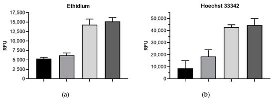 The intracellular accumulation of fluorescent dyes was determined as described previously [,,], with minor modifications. Briefly, bacteria from an overnight cultivated MH2 agar plate were suspended in PBS (phosphate buffered saline, pH 7.4) supplemented with MgCl2 and with glucose to final concentrations of 1 mM and 0.4%, respectively. The suspensions were adjusted to an OD600 of 1 and immediately used for determining the intracellular accumulation of dyes, which were added to a final concentration of 2.5 µM for ethidium bromide, 2.5 µM for Hoechst 33342, 30 µg/mL for berberine, 200 µM for PAβN (β-napththylamine determination), and 22.5 µM for Pyronine Y. Fluorescence was measured in the TECAN Infinite M200 PRO plate reader (Crailsheim, Germany) with an incubation temperature of 37 °C. For ethidium, the excitation and emission wavelengths were 518 and 605 nm, respectively, for Hoechst 33343 350 and 461 nm, for berberine 355 and 517 nm, for β-naphthylamine 320 and 460 nm, and for Pyronine Y 545 and 570 nm. Fluorescence values were corrected by subtracting the values detected from the bacterial suspensions without dye.