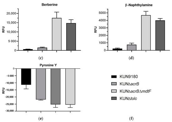 Regarding berberine and β-naphthylamine, the latter being the intracellular fluorescent cleavage product of the efflux pump inhibitor PAβN (phenylalanine arginine β-naphthylamide) [], the accumulation seemed even higher within the acrB/mdtF double-knockout versus the KUN∆tolC mutant, but the differences were not significant (p values > 0.05).