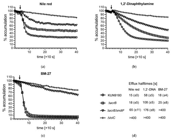 Real-time efflux with fluorescent dyes (the arrow indicates the addition of glucose for the re-energization of the efflux-arrested cells loaded with dye): (a) Nile red; (b) 1,2’-dinaphthylamine (1,2′-DNA); (c) BM-27. (d) Graph legend for panels (a–c) and efflux halftimes (means with SD, n ≥ 3) detected with the KUN9180 isolate and its mutants.