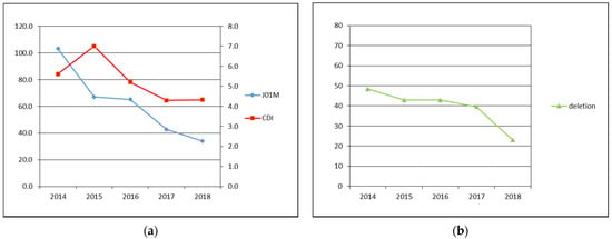 (a) Primary axis: J01M—fluoroquinolone antibiotics consumption in DDD per 1000 patient-days, secondary axis: CDI—CDI incidence in cases per 10,000 patient-bed days; (b) deletion—prevalence of tcdC gene deletion identified by GeneXpert in %.