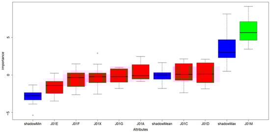 Results of Boruta algorithm; color legend: blue boxes: shadow features added by Boruta algorithm used for evaluation of significant and insignificant variables in scope. Green box: significant/important properties, Red boxes: insignificant/redundant properties in dataset.