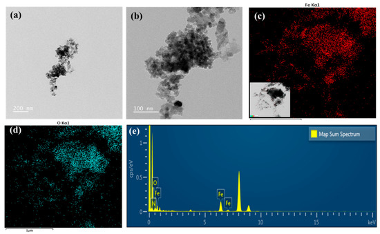 TEM micrograph of PD-FeO NPs. Different magnification of PD-FeO NPs (a,b), elemental mapping of Fe and O (c,d), and elemental analysis—(e).