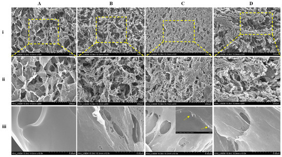 UHR-FE-SEM observation of chitosan—(A), Chitosan/PVA sponge—(B), PD-FeO NPs (0.01%) incorporated chitosan/PVA sponge, and inner slide shows presence of PD-FeO NPs—(C), PD-FeO NPs (0.03%) incorporated chitosan/ PVA sponge—(D). Under different magnification such as 500 µm (i), 200 µm (ii), and 5 µm (iii).