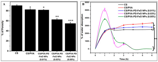 The different concentration of PD-FeO NPs incorporated CS/PVA nanocomposite sponge. Porosity—(A); Water absorption—(B). * (p < 0.05), ** (p < 0.01), and *** (p < 0.001) significant.