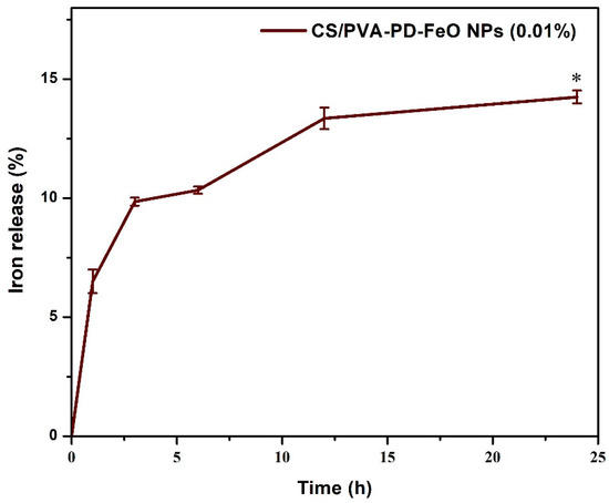In vitro iron release from CS/PVA-PD-FeO NPs sponges at pH 7.4. * indicates the significant higher release of iron at 24th h comparing to 1st h of interval (p < 0.05).