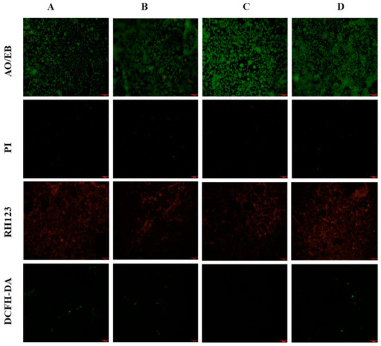 Further, cytotoxicity of PD-FeO NPs, CS, CS/PVA-PD-FeO NPs treated HEK 293 cells was evaluated under a fluorescence microscope using various fluorescence staining (AO/EB, PI, RH123, and DCFH-DA).