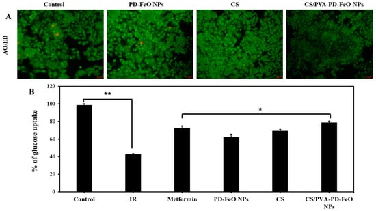 Cell viability and glucose uptake efficiency of nanocomposite treated IR-HepG2 cells. AO/EB staining of various samples treated IR-HepG2 cells—(A); glucose uptake efficiency of nanocomposites—(B). (** p < 0.01), (* p < 0.05).