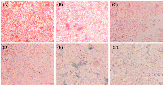 Prussian blue stained PD-FeO NPs cellular internalization in HEK293 cells visualized under the light microscope (10× magnification). The blue staining indicated the presence of PD-FeO NPs. Control—(A), chitosan—(B), PVA—(C), CS/PVA—(D), PD-FeO NPs—(E), and CS/PVA-PD-FeO NPs—(F).