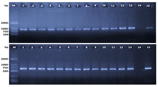 Amplified products of representative A. hydrophila isolates from tilapia (n = 5), carp (n = 4) and channel catfish (n = 4) of Aeromonas genus (953 bp)—upper ranges and A. hydrophila species (625 bp)—lower ranges: M: DNA ladder; lane 1–13 representative isolates from diseased fish; lane 14-negative control; lane 15-positive control (A. hydrophila ATCC 7966).