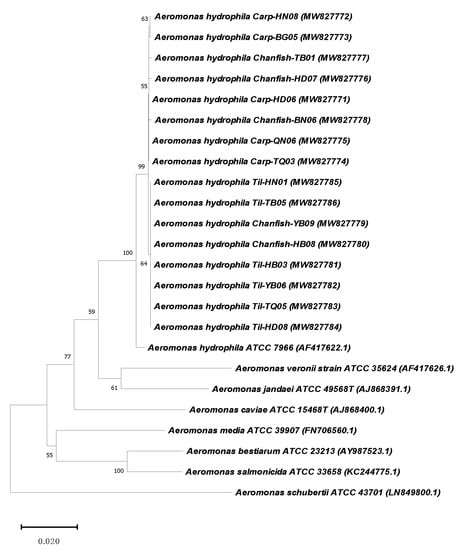 - Hoai, T.D.; Trang, T.T.; Van Tuyen, N.; Giang, N.T.H.; Van Van, K. Aeromonas veronii caused disease and mortality in channel catfish in Vietnam. Aquaculture 2019, 513, 734425. [Google Scholar] [CrossRef]