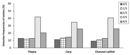 The detection frequencies of the A. hydrophila isolates from cultured tilapia, carp, and channel catfish carrying 0–4 virulence genes out of the 5 tested genes in the study.