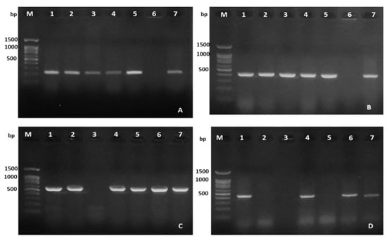 PCR amplification of virulence genes carried in representative A. hydrophila isolates. M: DNA ladder; lane 1–7 representative amplified products of act gene (232 bp) (A); aerA gene (431 bp) (B); hlyA gene (597 bp) (C); and alt gene (442 bp) (D).