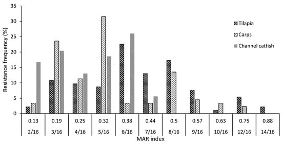 The distributions of multiple antibiotic resistances (MAR) of A. hydrophila isolates from cultured tilapia, carp, and channel catfish. None of the isolates was resistant to only 0 or 1 agent. The values 2/16 to 14/16 mean that the isolates showed resistance to 2 to 14 out of 16 antimicrobial agents with the corresponding MAR values.
