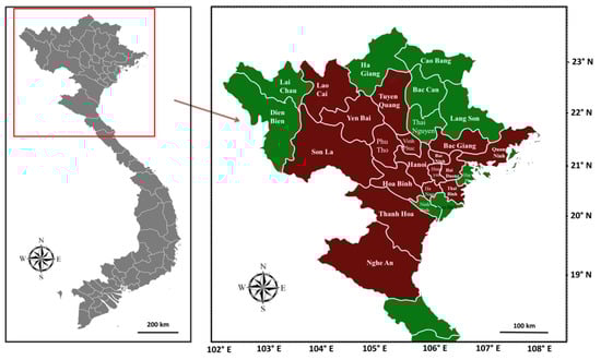 In 2019–2020, a total of 506 diseased fish (moribund or recently died) of three cultured species including tilapia (198 samples), carp (mainly common carp and grass carp; 187 samples), and channel catfish (121 samples) were collected from 54 farms of the major culture areas located in sixteen provinces in Northern Vietnam (Figure 8). The fish samples were placed in sterile sealed plastic bags, transferred to the laboratory of the Department of Aquatic Environment and Fish Pathology—Faculty of Fisheries, Vietnam National University of Agriculture (VNUA) in a cold box (below 4 °C), and immediately analyzed. Clinical signs and gross features of all diseased fish were observed and recorded.
